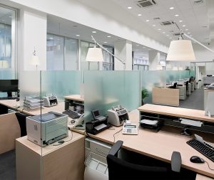 Empty bank office with desks in raw