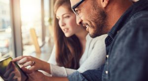 Happy young man with his girlfriend in a coffee shop surfing internet on digital tablet. Young couple in a restaurant looking at touch screen computer.