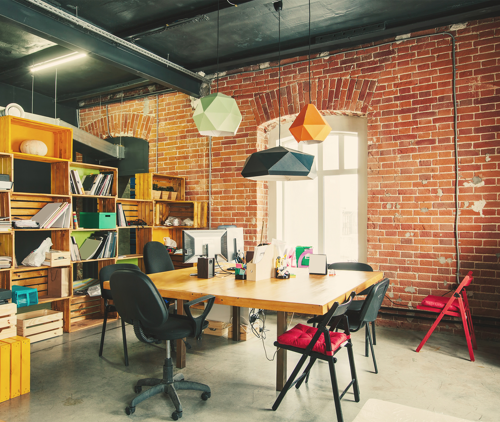 Modern office Interior with old vintage brick Wall. Art work space