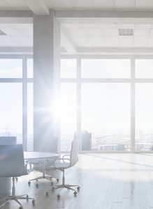 White office 3D render interior in day light. Mixed media
